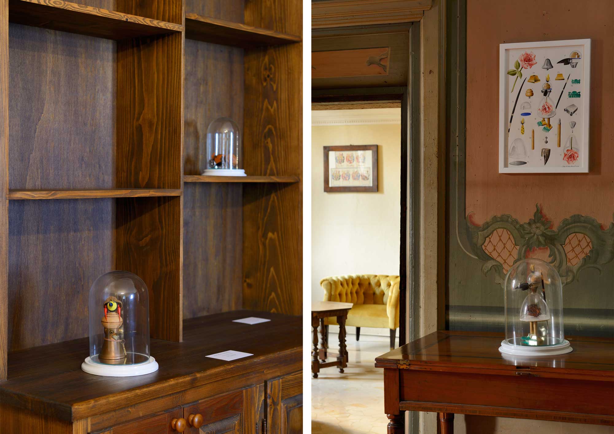 Nature, and artificial small figures obtained by the artist from common objects, give birth to a new cosmic order. Angelo Maisto characters, after being classified in a sort of "Codex Maisti", inhabit the Palace rooms as they were always been there. Angelo Maisto is extremely careful in the selection fo subject: flowers, birds and new creatures require time and precision; watercolors on paper and sculptures create a magnificent balance between the armony of nature and human creativity.
